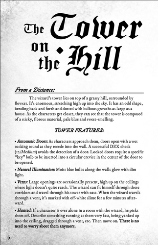 In the tranquil hamlet of Canny, there's a bounty out on a wizard. Allegedly, he wreaked some havoc before escaping to his Tower on the Hill to the north. As the characters discover the carnage he left behind and begin to explore his sinister lair, it becomes increasingly clear that whatever they're dealing with is definitely not a wizard- but he's somehow convinced everybody else that he is.